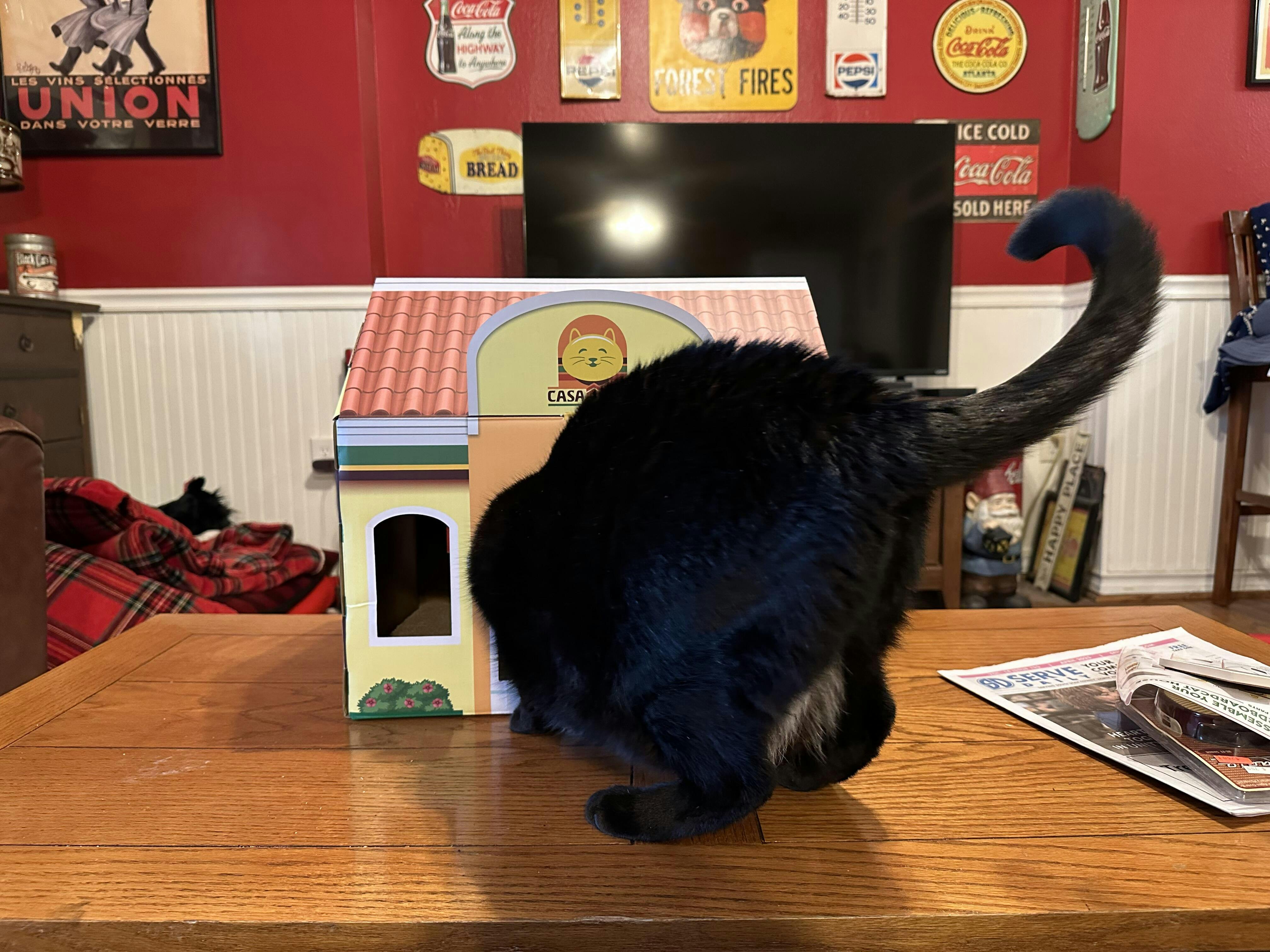 This Casa Gato cat house is a perfect treat for your cat. Cats love hiding and scratching cardboard, so this combines the best of both worlds. The design is adorable and features a drive-thru window and a cleverly designed menu. Setting up cardboard cat houses can be tricky, but I found this was easier to assemble compared to others I've used in the past. If you have bigger cats, this might not be the best fit. I have a petite cat who is about 9 lbs. who enjoys it. The 12 lb. cat also enjoys it but it's clearly a little bit too small. I would say this is best suited for small cats or kittens.